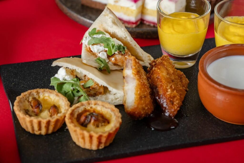 セイボリーには、名古屋コーチン卵と鰻のキッシュやミニ味噌カツ 特製味噌ダレなど、名古屋らしさを感じるメニューがズラリ。これらに加えて、開発担当者の推しメニューである「チキンケバブとフェタチーズのピタパン」も登場。スパイスでマリネし、低温でしっとり火を入れたチキンケバブと、塩味の効いたギリシャチーズをピタパンに挟んだモダンオリエンタルなセイボリーです。
