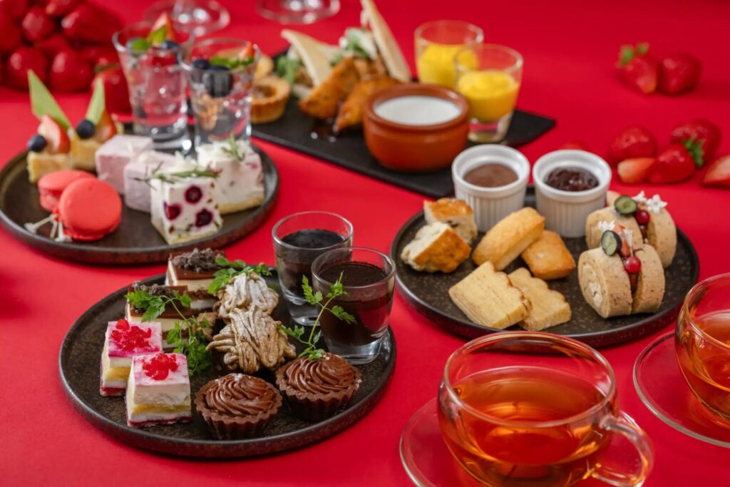 ベリーとスパークリングワインのジュレ、いちごのマカロン、いちごのギモーブ、フレッシュフルーツのタルト、リコッタチーズとベリーのセミフレット、チョコレートプリン、ショコラタルトレット、キャラメルサレ、チョコレートモンブラン、ショコラパウンド、バウムクーヘン、ミニフィナンシェ、ベリーとチョコレートのロールケーキ、サルタナレーズンスコーン、いちごジャム&チョコレートとナッツのスプレッドセイボリー