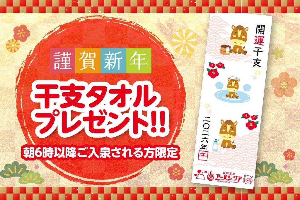 元旦の1月1日(木)には、新年の始まりを祝う干支がデザインされたオリジナルタオルをプレゼント企画も開催。初風呂でのんびり温まりながら、お得をゲットしちゃいましょう!