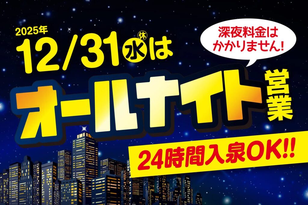 大みそか日の12月31日(水)は、24時間入泉OKのオールナイト営業を実施。オーバーナイト営業では深夜料金が必要となりますが、大みそかオールナイト営業では深夜料金なしで利用可能です。年越しの瞬間を温泉で迎え、そのまま元旦の朝までゆっくりと過ごせます。