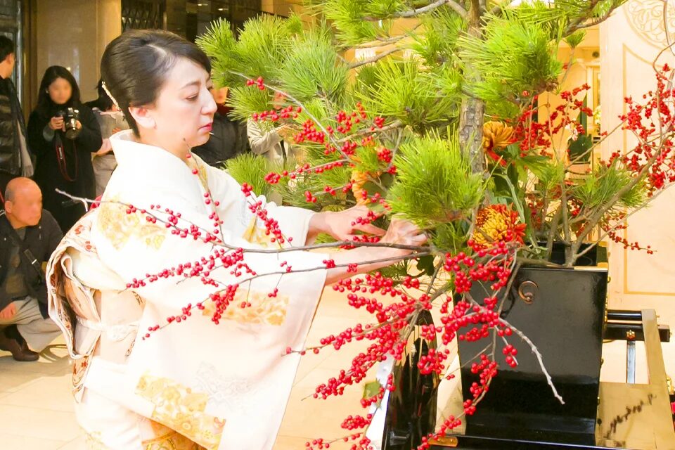 鏡開きと振る舞い酒の後は、1月1日11時より1階ロビーにて華道 石田流家元 新春初いけ式を開催。華道石田流家元 石田巳賀氏による新年を祝ういけばなの大作がその場で仕上げられ、心を奪われる「雅」の風情を楽しめます。