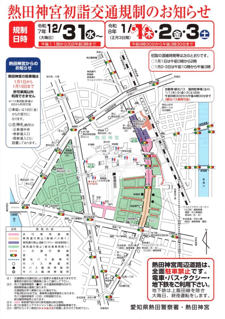 この記事では、2026年の熱田神宮の初詣に伴う交通規制情報と、周辺の駐車場情報をまとめてご紹介します。