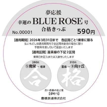 「夢応援・合格きっぷ」は、「夢応援・幸運のBLUE ROSE号」のヘッドマークをイメージした丸形デザインの”合格祈願”乗車券。5(ごう)・か・9(く)で合格の語呂合わせで、渥美線の駅ナンバー「⑤南栄駅」および「⑨向ヶ丘駅」を組み合わせたものとなっています。
