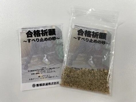 1月9日(金)~2月28日(土)までの間に「夢応援・合格きっぷ」「渥美線アクリルキーホルダー受験生応援ver.」のいずれかを購入すると、豊橋鉄道の市内線で車輪の空転を防ぐため実際に線路へまいている「すべり止めの砂」がプレゼント。プレゼントされる「すべり止めの砂」も合格祈願の御祈祷を受けていますので、”すべらない”御利益にあふれていることでしょう。