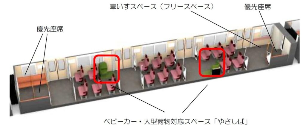 「やさしば」は車両中央の乗降扉付近に1両あたり2カ所設置されるとのこと。ベビーカーや大型荷物がある方をはじめ、全ての乗客が利用可能となっています。