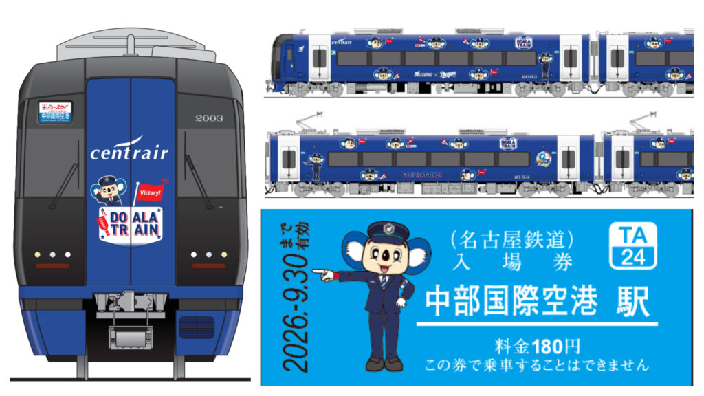 名古屋鉄道にドアラまみれの”ブルーミュースカイ”が登場! 名古屋鉄道と中日ドラゴンズのコラボによるラッピング電車「DOALA TRAIN(ドアラトレイン)」が2026年1月26日より運行されます。