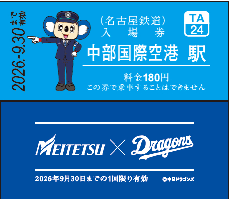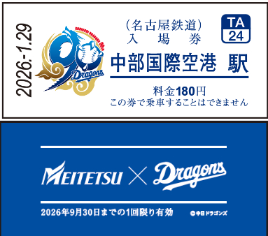 また、出発式が行われる1月29日には、中部国際空港駅 3番線ホームにオリジナルコラボグッズを販売する特設ブースも登場。数量限定の中日ドラゴンズ90周年を記念した特別バージョンのコラボ硬券入場券など、4種類のオリジナルグッズが登場します。