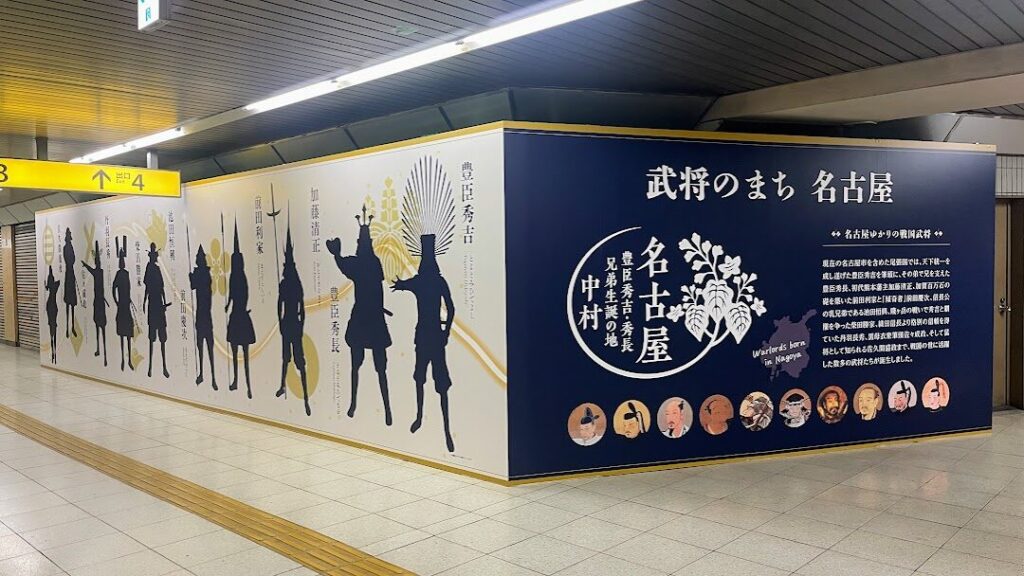「豊臣ミュージアム」へ向かうには、地下鉄東山線『中村公園』駅を利用するのが便利。駅の改札をくぐると、早速豊臣秀吉・秀長兄弟をはじめとした武将たちがお出迎えしてくれます。