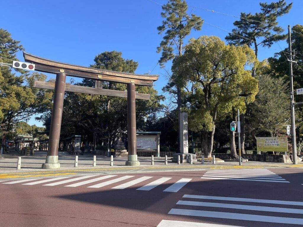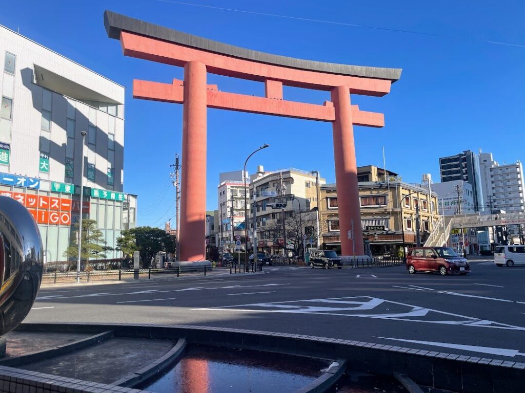 2番出口から上がると、中村のシンボルとなっている朱色の大鳥居の雄大な姿を真正面に見ることができます。