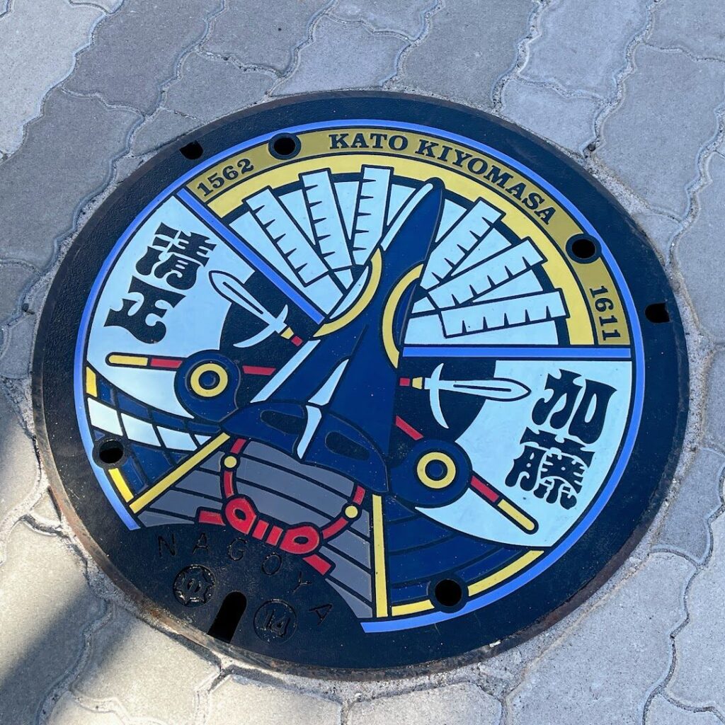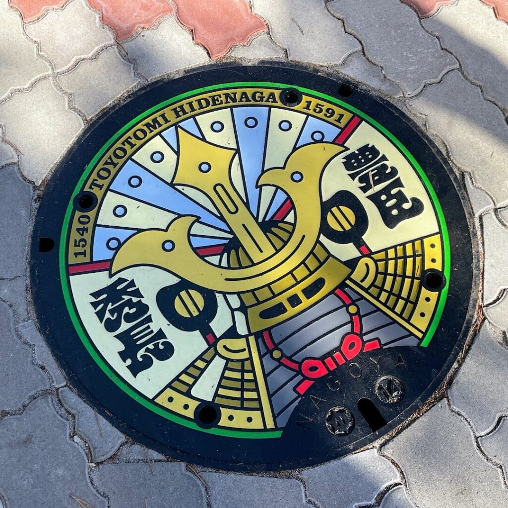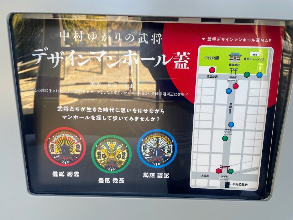 そして、参道を歩くときには”足下”にも注目!「豊臣ミュージアム」の開設に合わせる形で、中村縁の武将である豊臣秀吉・豊臣秀長・加藤清正のデザインが施されたデザインマンホール蓋が設置されました。