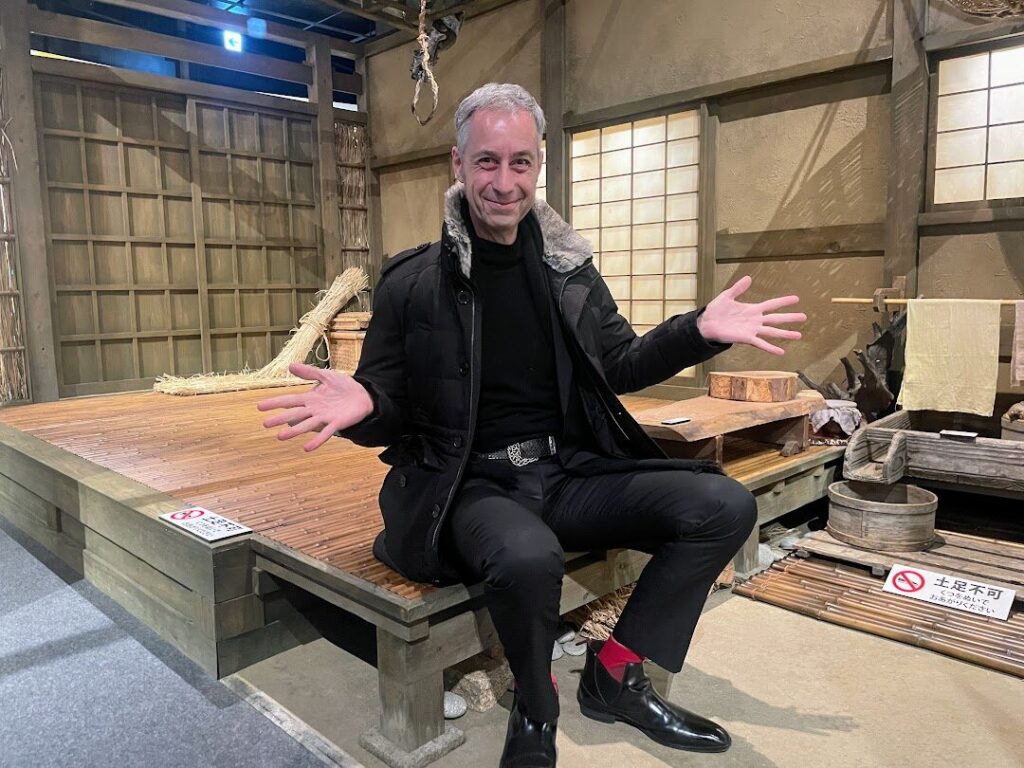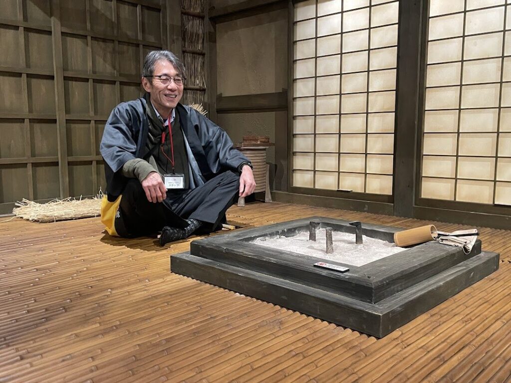 「小一郎の家」では、セットに上がっての撮影もOK!小一郎や藤吉郎になりきって撮影することも可能です。なおセットは土足NGなので必ず靴を脱いで上がってください。(今回は案内スタッフの方に撮影へのご協力いただきました。)