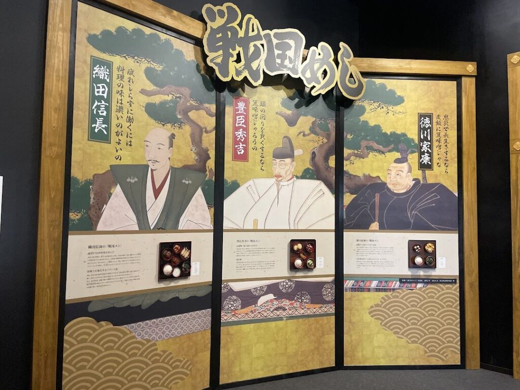 「大河ドラマ館」の出口にあるのが、名古屋市独自展示の「武将も唸る!戦国めし×なごやめし」展。織田信長・豊臣秀吉・徳川家康の郷土三英傑が食べていた食事や、様々な名古屋めしについて詳しく紹介されています。