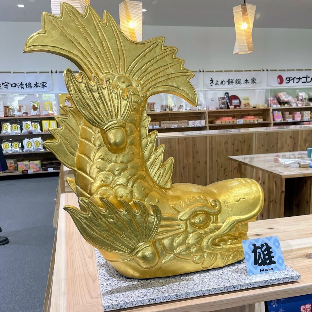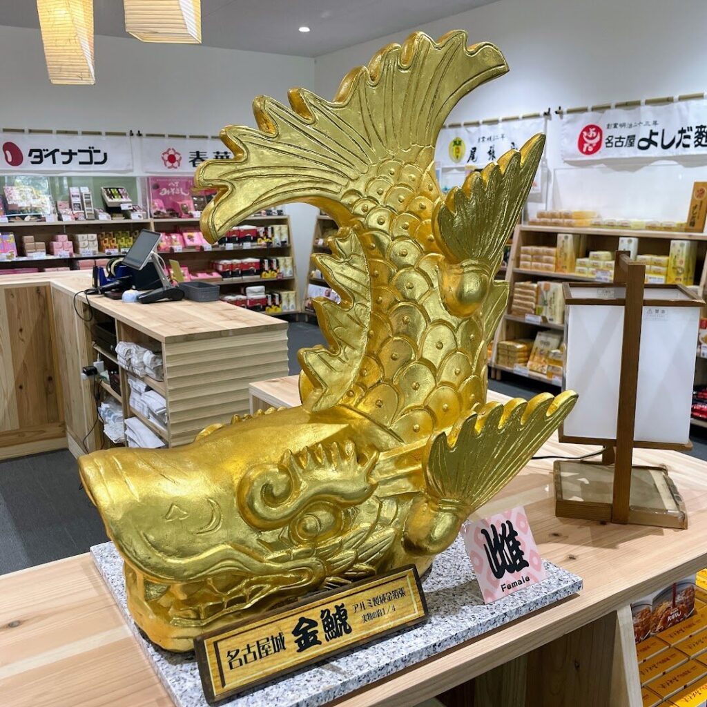 ミュージアムショップでひときわ目を引くのが一対の金鯱! 実物の4分の1の大きさで作られた金鯱は本物の金鯱の図面に基づいて作られた精巧な作りとなっています。雄と雌をそれぞれ制作し、名古屋城と同じように「北側に雄、南側に雌」を配置している点もこだわりを強く感じます。(なお、こちらの金鯱オブジェは非売品です)