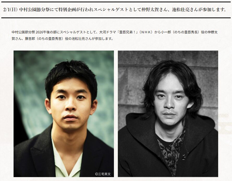 そんなスペシャルな1年を迎えた2026年の中村公園節分祭では、特別企画の開催が決定!中村公園節分祭 2026午後の部に、大河ドラマ『豊臣兄弟!』(NHK)から小一郎(のちの豊臣秀長)役の仲野太賀さん、藤吉郎(のちの豊臣秀吉)役の池松壮亮さんが参加することが発表されました。