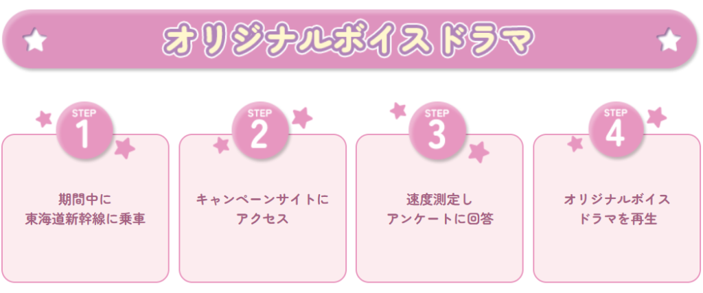 また、オリジナルボイスドラマを聞く際には位置情報による速度測定が行われるため、発車直後や到着直前、また東京駅~新横浜駅間など一部の区間ではアクセスができない場合があるためご注意ください。