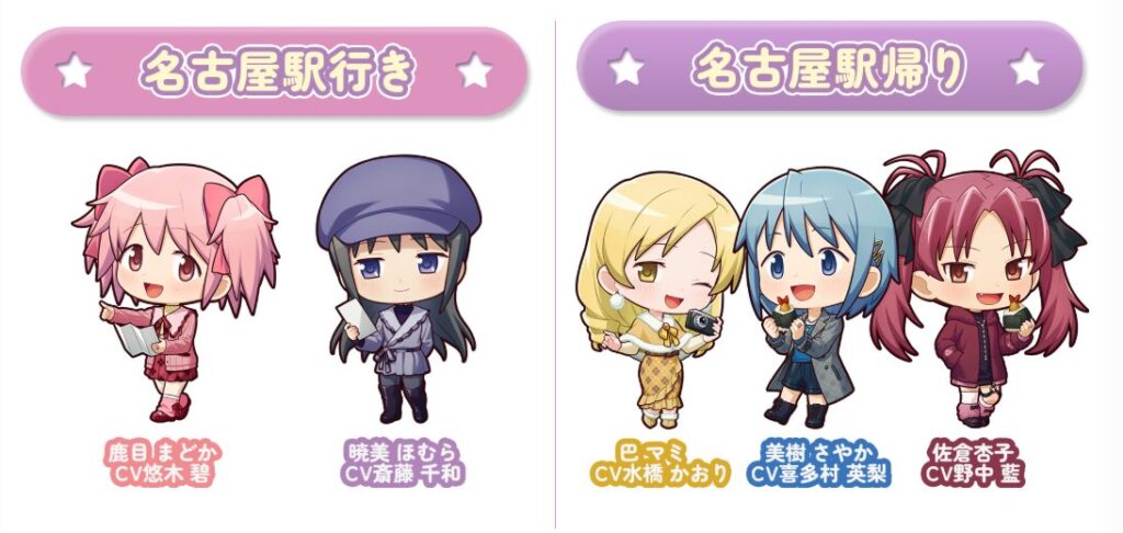 名古屋へ行くときは「鹿目まどか・暁美ほむら」、名古屋からの帰りは「巴マミ・美樹さやか・佐倉杏子」のオリジナルボイスを楽しめる!