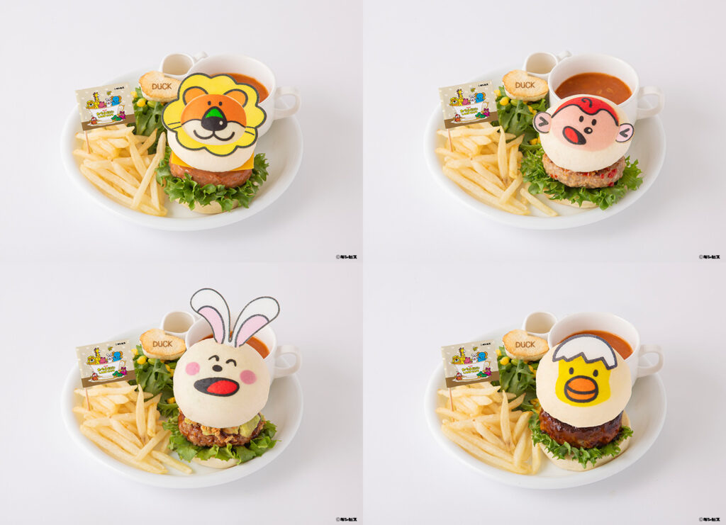 フードメニューには2025年に開催された『たべっ子どうぶつLAND』で大人気だったハンバーガーが登場! どうぶつさんたちがデザインされたかわいいハンバーガーにミネストローネ、ポテト、サラダを添えてプレートにした、ボリュームたっぷりの「とくせい!もぐもぐどうぶつさんバーガープレート」を楽しめます。