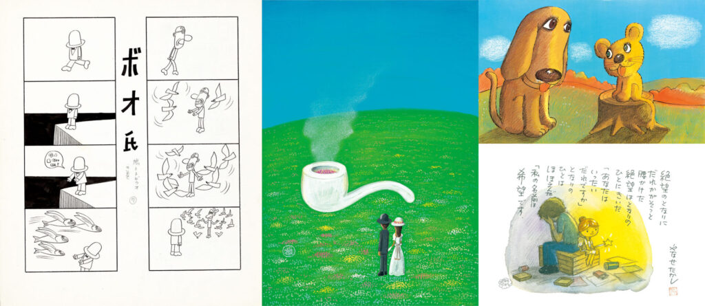 会場は「週刊朝日マンガ賞」を受賞してやなせたかし氏の転機となった1967年のコマ漫画作品「ボオ氏」をはじめ、やなせ氏が編集長を務めた詩と絵を中心とした雑誌「詩とメルヘン」の表紙絵や詩の作品、また、やなせ氏が手がけた絵本の原画も多数展示されます。