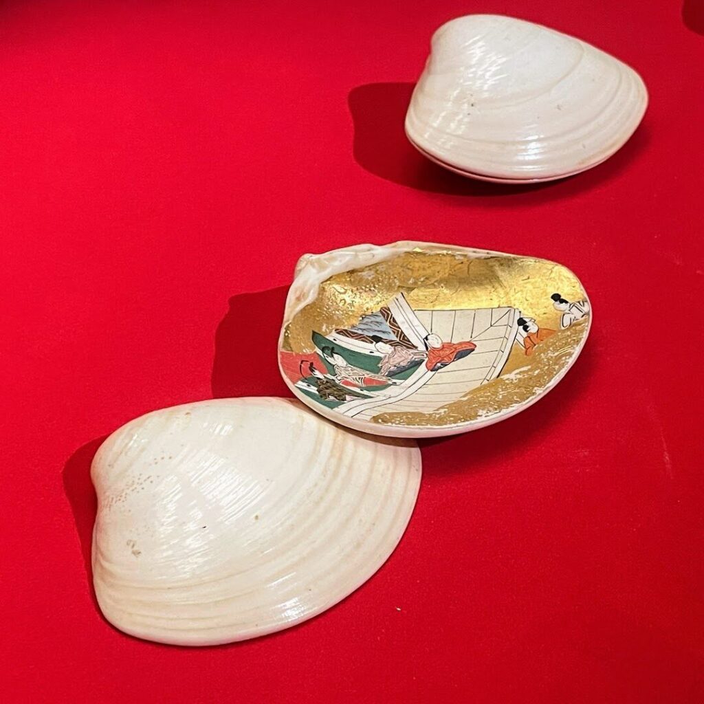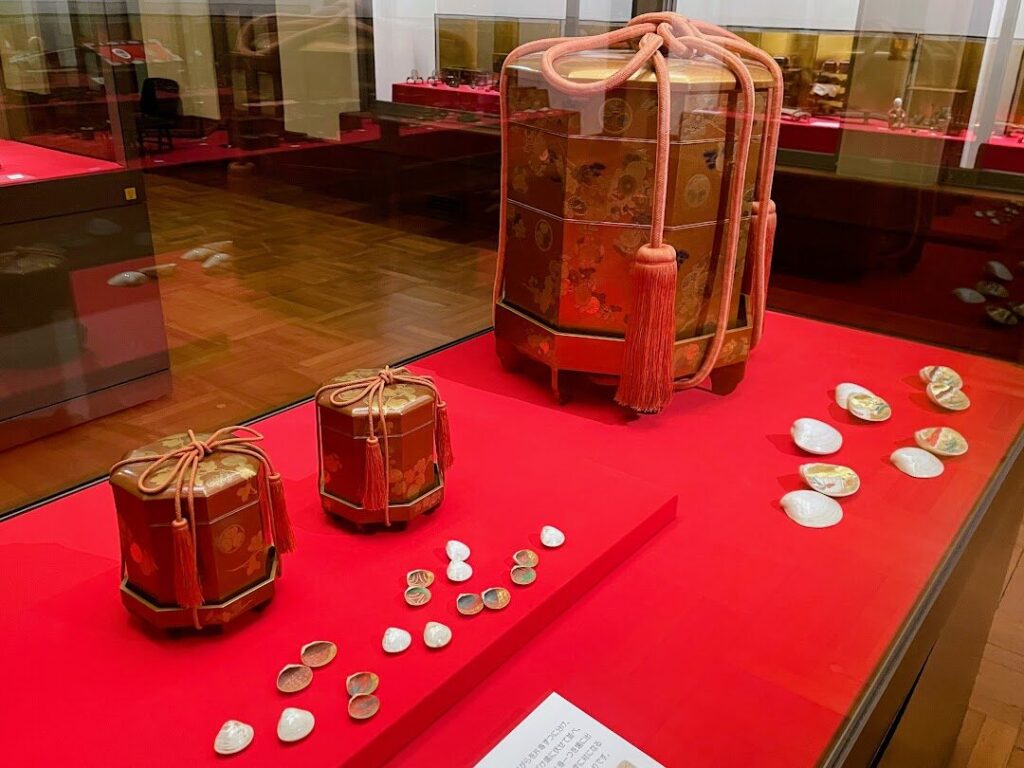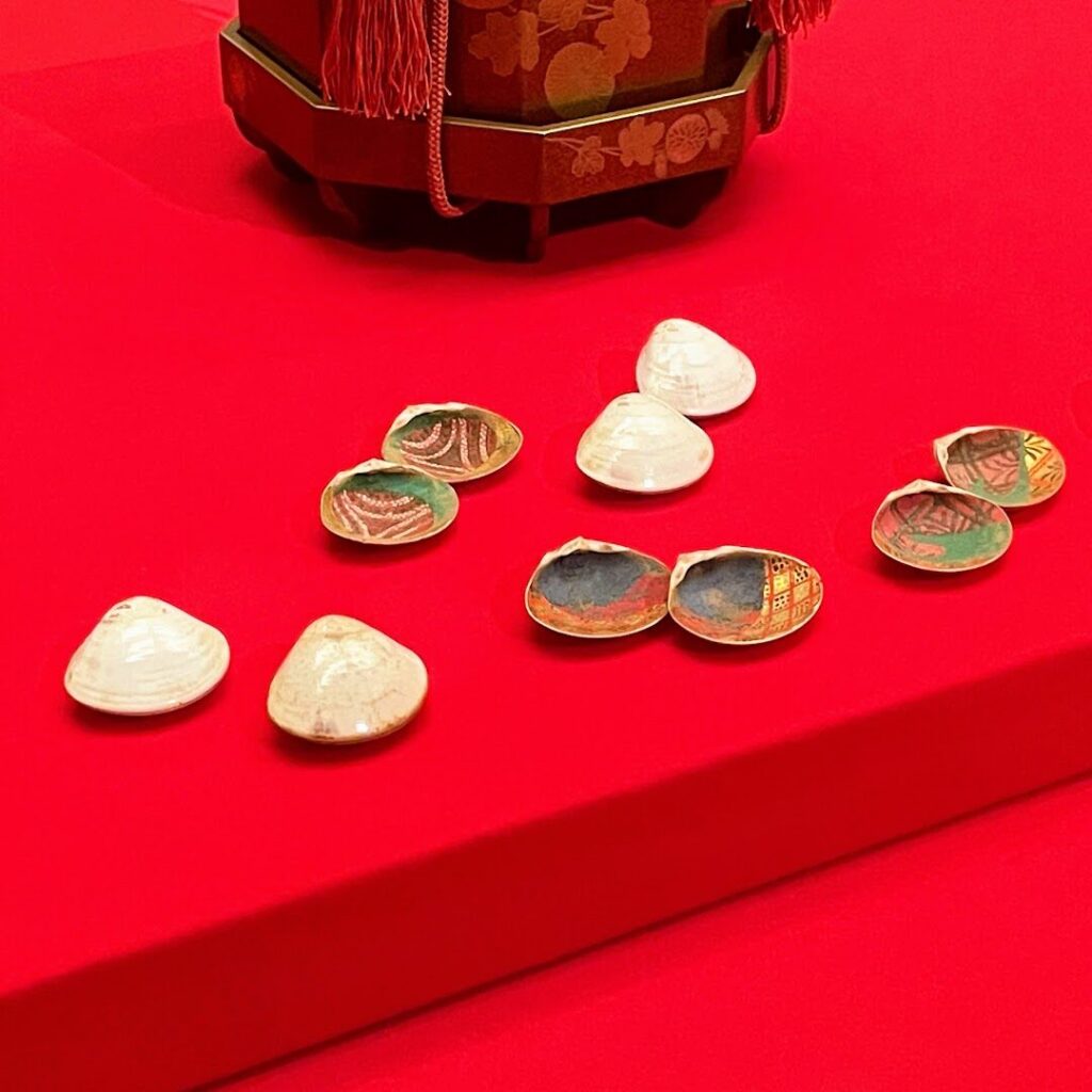 また、貝桶だけでなく、それぞれの合貝も注目のポイントです。合貝ははまぐりの貝殻から作られますが、ミニチュア版である雛道具の合貝も小さいサイズのはまぐりの貝殻で作られているとのこと。ただミニチュア化するだけではなく、姫君の分身たる雛人形が実際に使うことができる”本物の小さな婚礼調度”として作られていたことが伝わってきます。