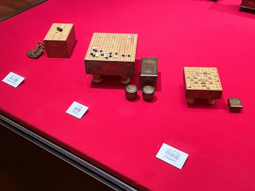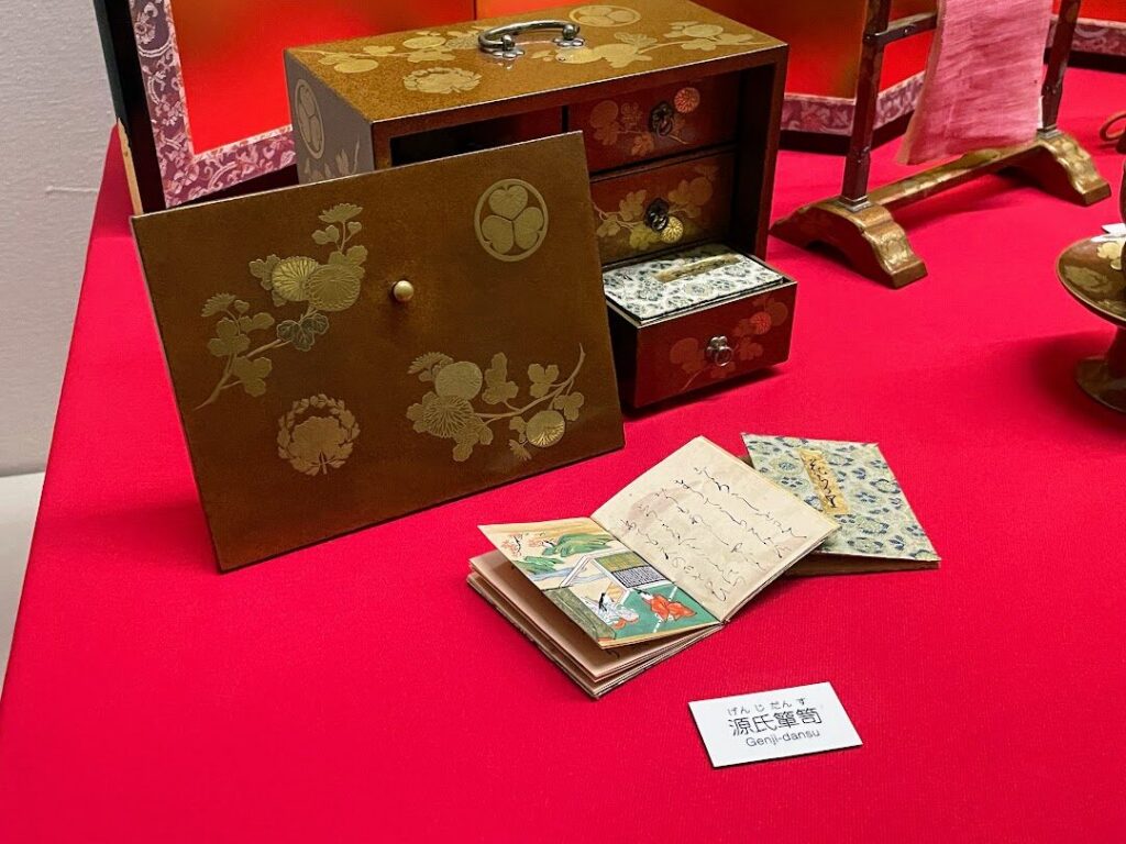 雛道具では、源氏物語の”豆本”が納められた源氏箪笥や、将棋盤・囲碁盤・双六盤なども展示。豆本は本の中身まで精巧に再現され、将棋盤・囲碁盤・双六盤もミニチュアサイズながらも実際に遊ぶことができる形で作られています。手間暇とお金をかけて作られた雛道具の数々は、権威のあらわれの一つともなっています。