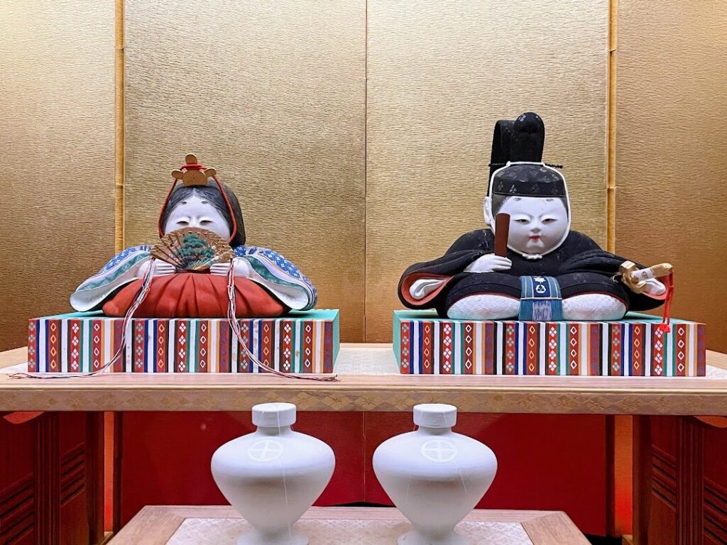 玄関ロビーでは名古屋の老舗人形店の雛人形がお出迎え