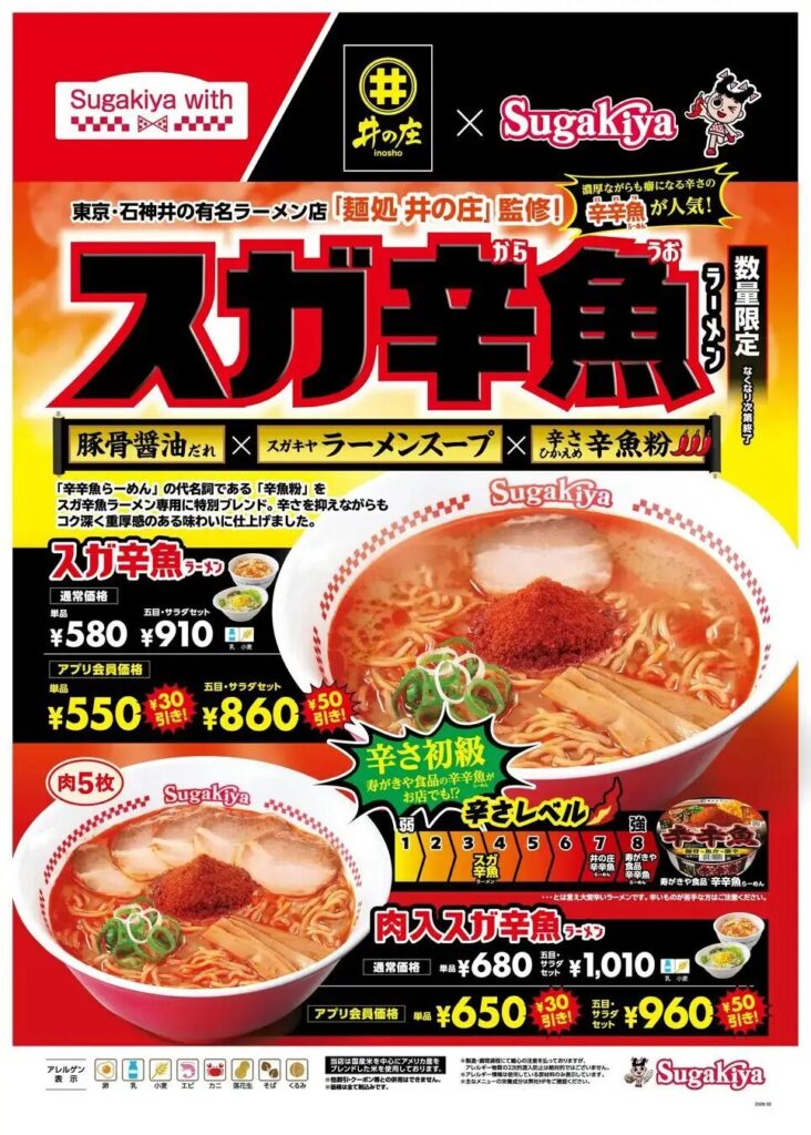 「麺処 井の庄」とのコラボによる”スガキヤ流激辛ラーメン”が「スガ辛魚ラーメン」が、本日2026年2月5日より一部店舗を除くスガキヤに登場。スガキヤの和風とんこつラーメンと大人気の激辛ラーメン「辛辛魚」が合体した注目の新商品がいよいよ発売開始となりました。