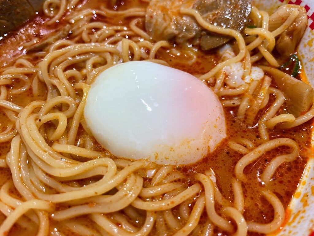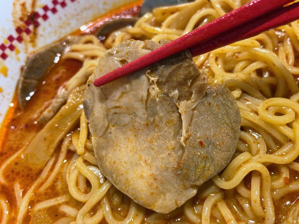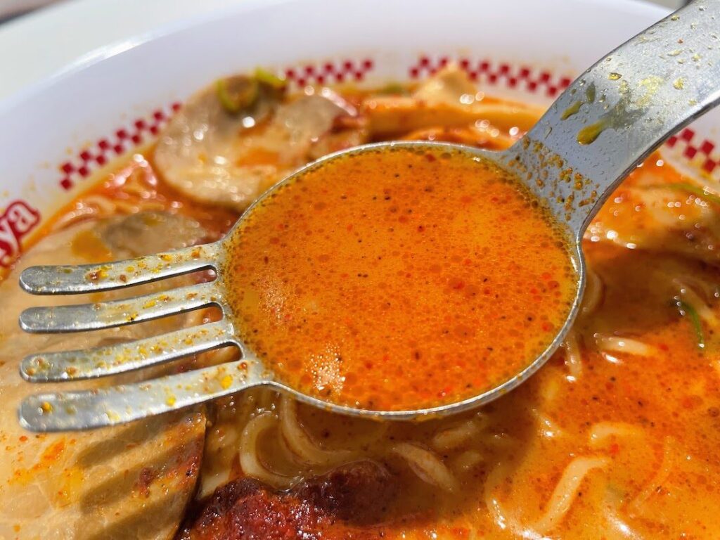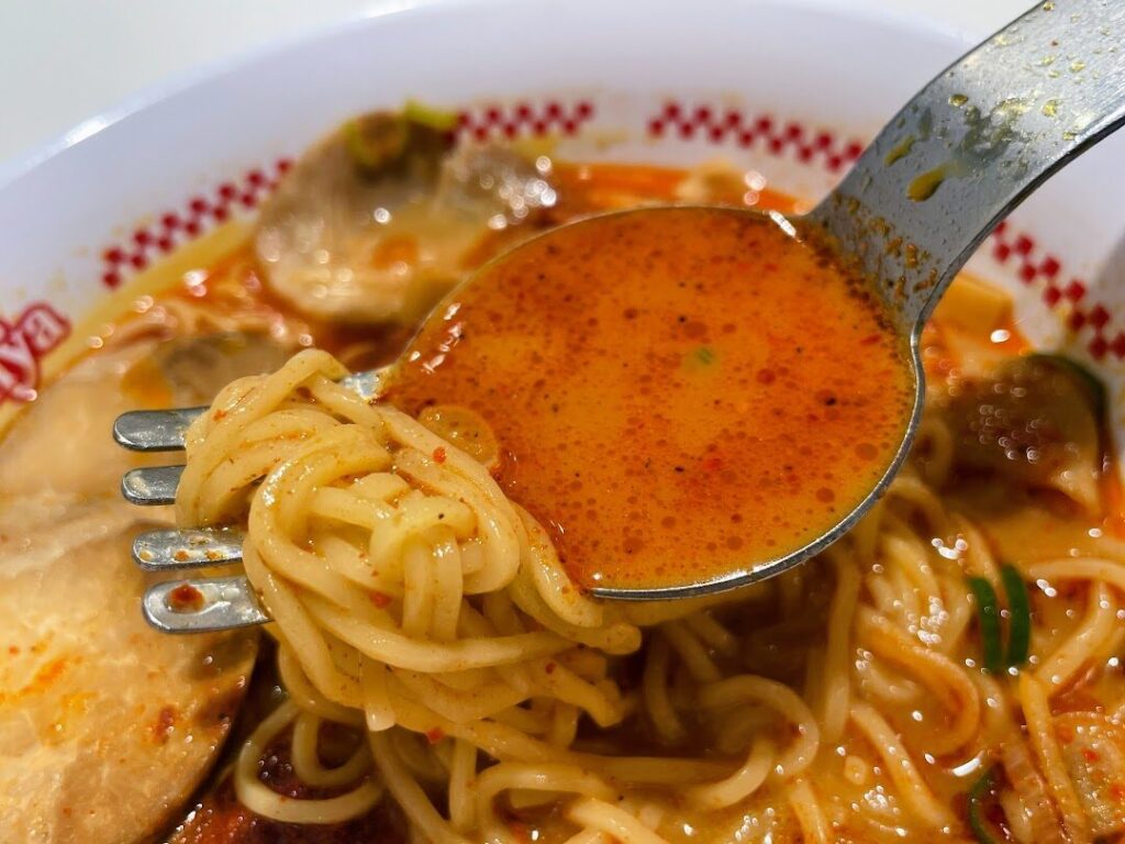 そして、麺とスープを一緒に頂いたときのおいしさが抜群!いつものスガキヤラーメンの麺の優しさあふれる味わいと旨辛なスープのバランスが抜群で、ちょうど良い辛さで食べ進めることが出来ます。