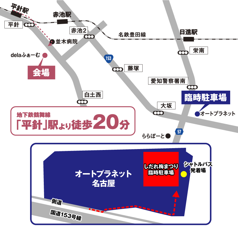 2月21日~3月8日までの土・日・月祝には、オートプラネット名古屋内に「しだれ梅まつり」が設置。臨時駐車場は無料で利用することができ、名古屋市農業センターdelaふぁーむまでシャトルバスが運行されます。車で行きたいという方は、臨時駐車場の利用もおすすめです。