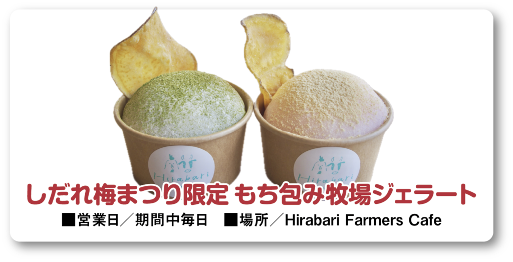 園内にある「Hirabari Farmers Cafe」では、しだれ梅まつり期間限定で「もち包み牧場ジェラート」が登場。行列が出来るほど大人気のジェラートを薄くて柔らかなお餅に包んだ新感覚スイーツも見逃せません。
