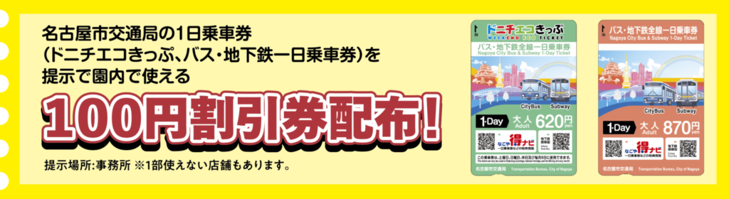 地下鉄&バスで向かう場合には「ドニチエコきっぷ」や「バス・地下鉄全線一日乗車券」を利用するのがお得。園内の事務所でこれらのきっぷを提示すると100円割引券がもらえます。