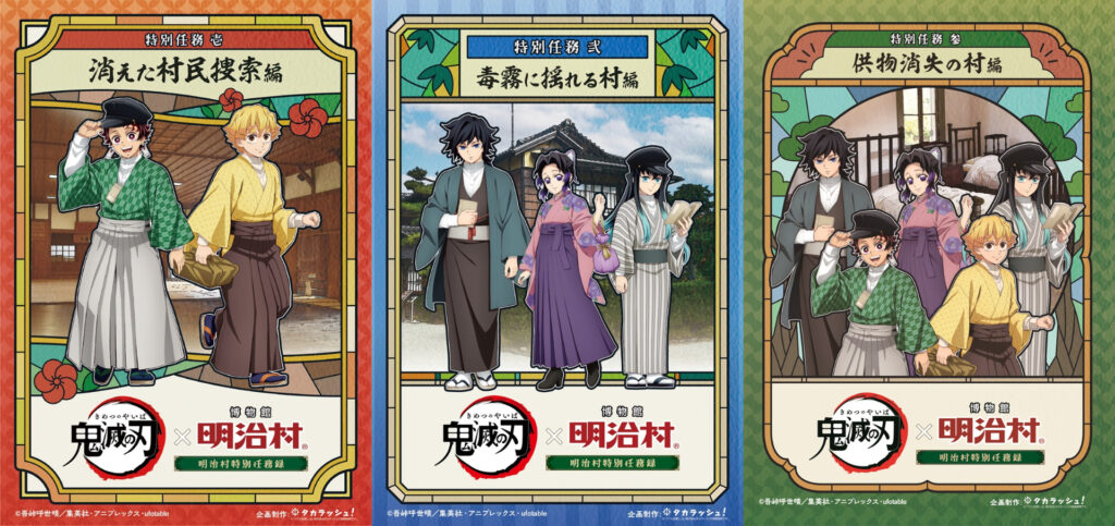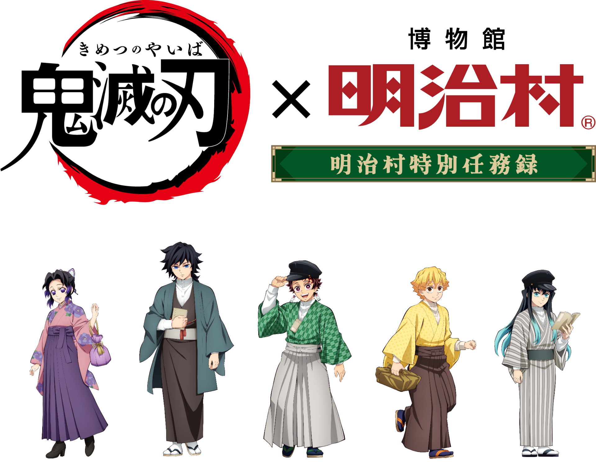 本イベントのために、竈門炭治郎・我妻善逸・嘴平伊之助・冨岡義勇・胡蝶しのぶの5名のキャラクターイラストをufotableが描き下ろし。鬼滅の刃のキャラクターたちが村内各所を演出するほか、明治村の人気企画となっている謎解きゲームを中心に、オリジナルコラボアイテムやコラボグルメなど様々な企画が展開されます。