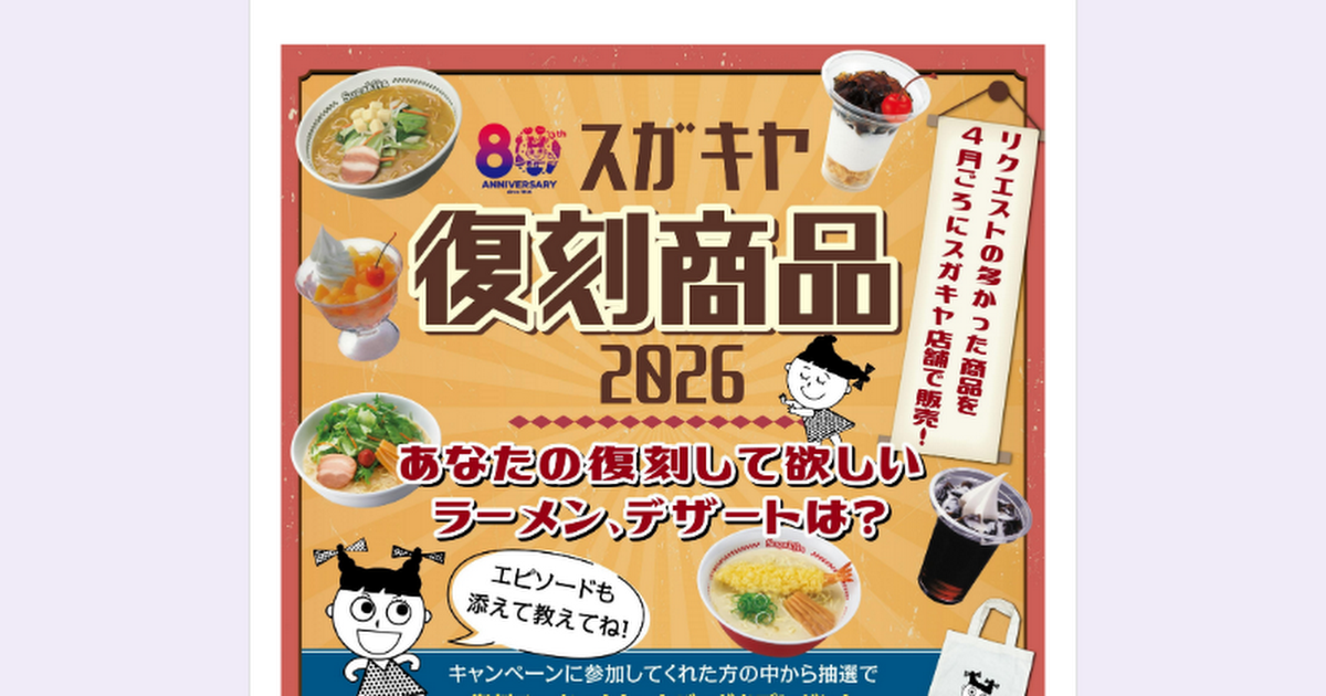 2026年4月からは80周年企画の第2弾として「復刻キャンペーン」の開催を予定しているとのこと。現在、復刻対象とするスガキヤ商品のリクエスト募集が行われています。リクエストを応募すると、「復刻スーちゃんトートバッグ」が抽選で当たるチャンスも! 2026年2月23日(月祝)まで、下記フォームにて応募できます。