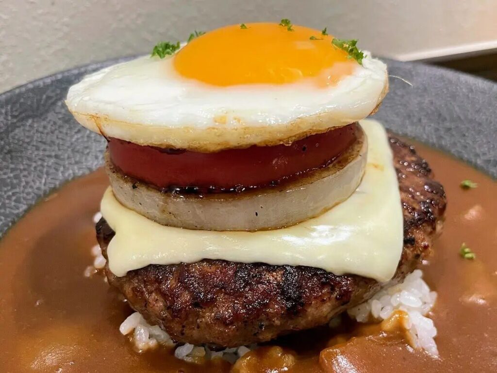 「あさくまSPカレー」には、牛すじカレーの上にハンバーグ、モッツァレラチーズ、グリルトマト、グリルオニオン、目玉焼きがまるでタワーのようにトッピング。見た目にもインパクトが強烈な、「カレーのあさくま」ならではのシグニチャーメニューです。