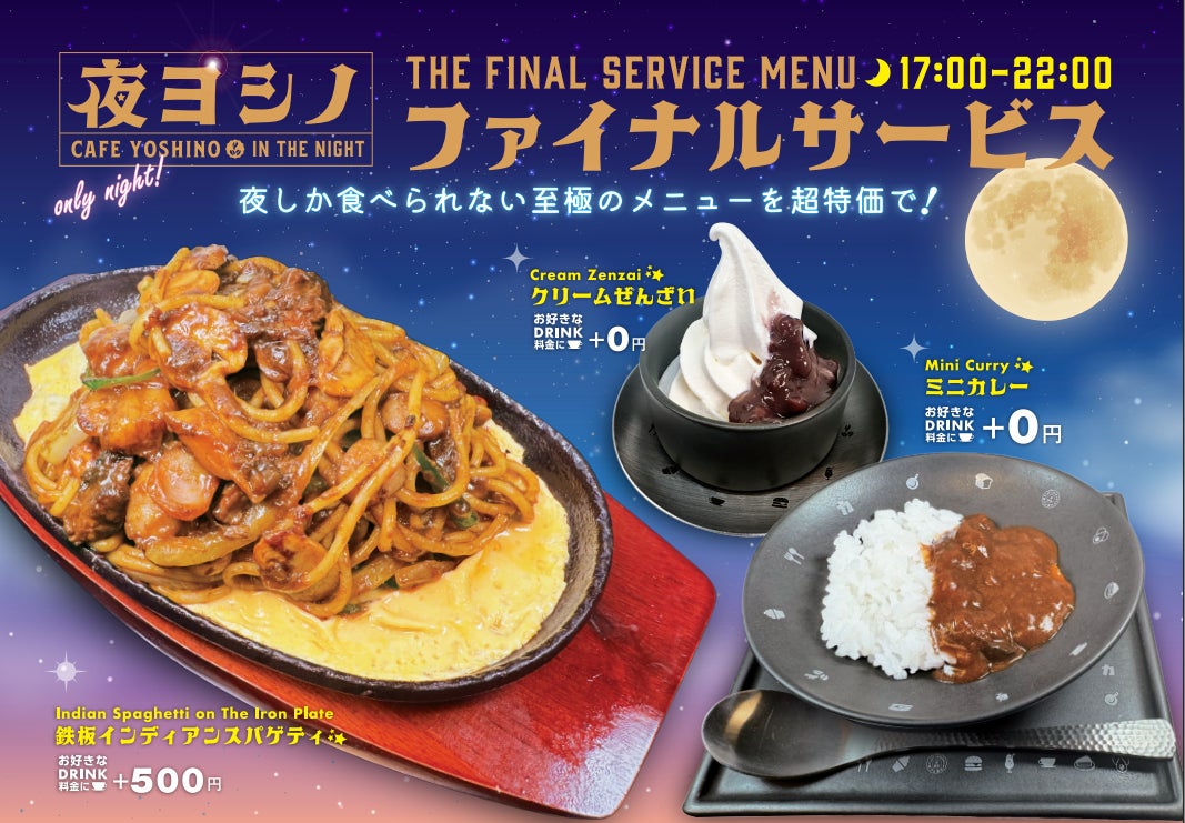 愛知県内に17店舗を展開する喫茶チェーン「カフェヨシノ」は、『カフェヨシノ中島店』にて、17時~22時までのディナータイムにドリンク代のみで「ミニカレー」や「クリームぜんざい」を提供する「ファイナルサービス」をスタート。7時~11時のモーニングサービス、14時~17時のアフタヌーンサービスと合わせ、ランチタイム以外は開店から閉店までお得なサービスが受けられるようになります