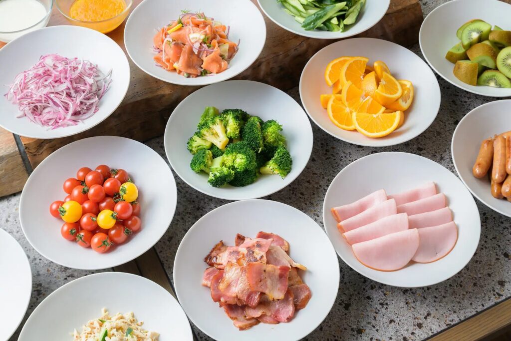ミニトマト、レッドオニオンスライス、キュウリ、コーン、ハネージュメロン、オレンジ、キウイフルーツ冷製・温製料理