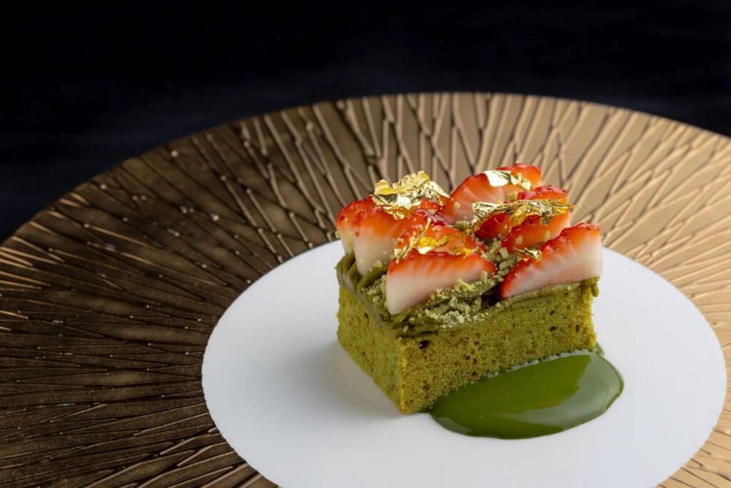 デザートには、秀吉が愛した「金の茶室」をイメージした「黄金の茶室 ~抹茶 苺 金箔~」が登場。濃厚な抹茶のパウンドケーキとクリームには金箔があしらわれ、絢爛豪華な文化が表現されています。仕上げにお客様の目の前で抹茶ソースをかけて完成させる、体験型のデザートです。