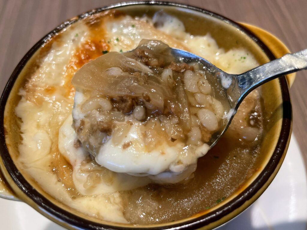 しっかりと旨味の強い濃い口のスープが最高に美味!玉ねぎはバケットはもちろん、粒のまま入った大麦のプチプチ感がたまりません。トローッと伸びるチーズとスープが織りなすハーモニーも最高of最高。一度食べたらヤミツキ一直線です。
