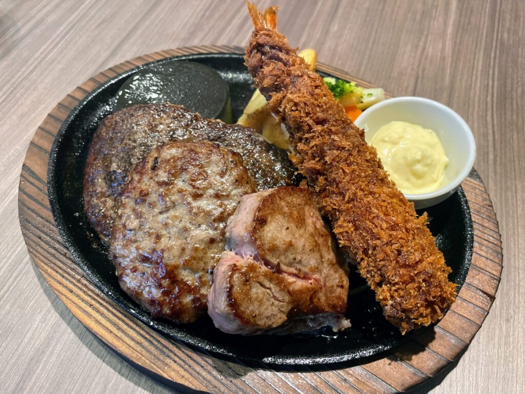 『メガコンボ』 ~ 社長推しのステーキ&ハンバーグ&学生ハンバーグが一皿に!