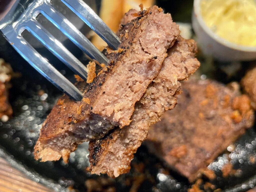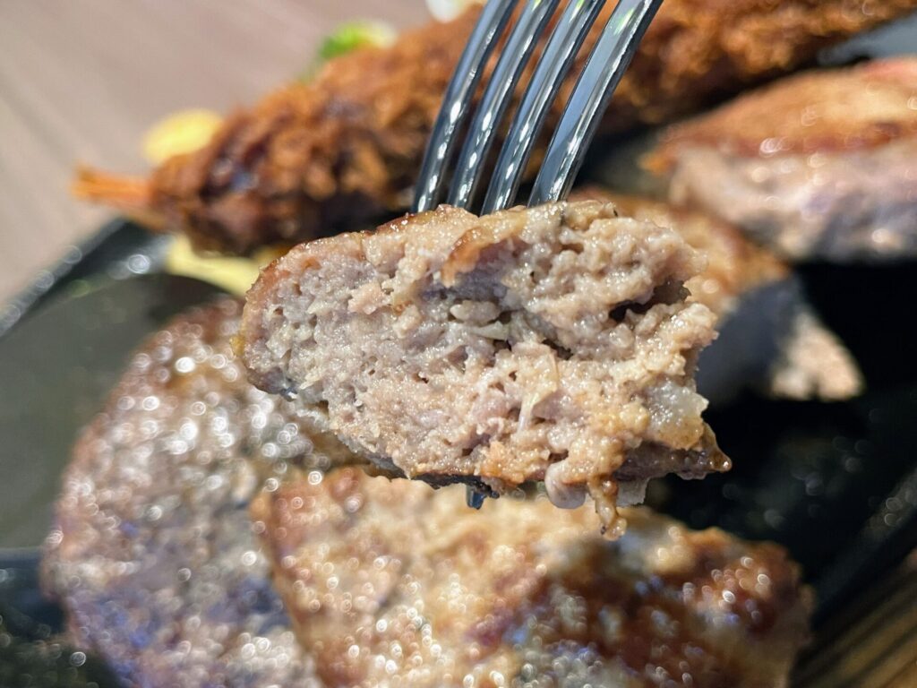 大判の肉をこんがりと焼き上げた「学生ハンバーグ」は、何と行っても肉感にあふれたワイルドな食べ応えが特徴。目をつぶっていただけば、ステーキと間違えてしまいそうになるほど”ステーキ館”にあふれていました。脂もしっかりとかんじられ、パンチのある味付けでヤミツキ一直線に。メガコンボには通常サイズと同じ180gの「学生ハンバーグ」がのってくるため、ワイルドさ満点の肉の美味しさをダイナミックに味わえます。