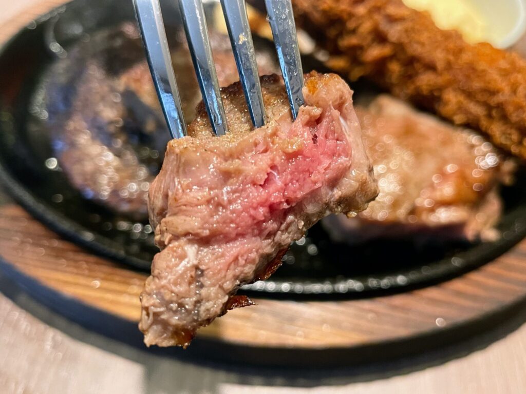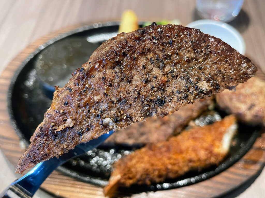 ミディアムに焼き上げられたサーロインステーキは、きめ細やかな肉質がとっても美味。噛みしめる度に肉本来の旨味がジュワッとあふれ出すのが何と行ってもたまりません。嫌な脂っぽさを感じることなく、”肉の旨さ”をトコトン味わうことができました。