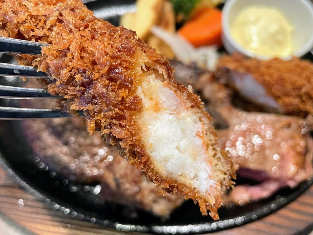 最初にご紹介するのは、あさくまの”社長推し”が一皿にてんこ盛りになった「メガコンボ」。”ステーキのあさくま”としてのこだわりが詰まった「サーロインステーキ」、肉汁溢れる映像がTV番組でも話題になった「あさくまハンバーグ」、そして創業者の思いとともにあさくまに受け継がれる「学生ハンバーグ」の、あさくまを代表する3つのメニューが一度に食べられる、超ごちそうメニューです。今回は3種類ある「メガコンボ」メニューの中から、”メガ”大エビフライコンボを試食させていただきました。