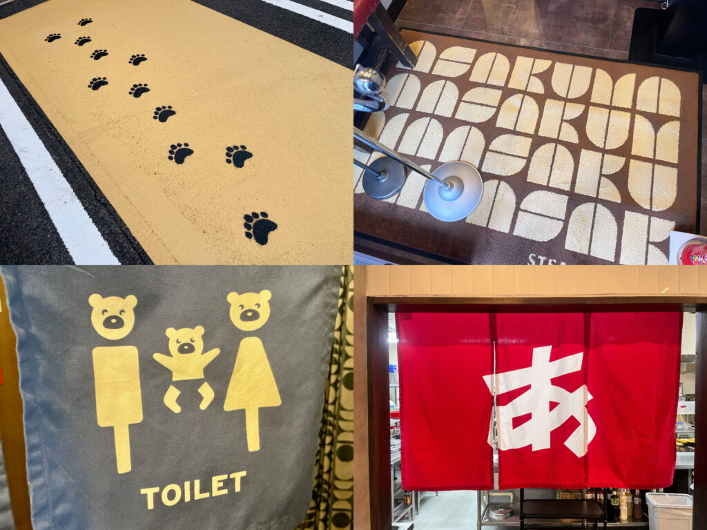 また、新しい「ステーキのあさくま」尾張旭店には、遊び心もいっぱい取り入れられています。例えばお店の入口には「くま」の足跡をペイント。玄関マットにも「ASAKUMA」の文字を取り入れ、プチレトロな雰囲気を演出しています。お手洗いも「くま」がご案内。そして厨房との仕切りには大きく「あ」と書かれた暖簾が、何と行ってもインパクト抜群でした。