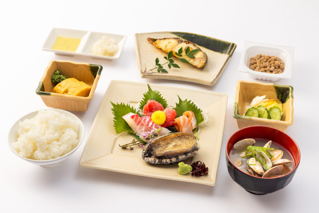 「魚屋の朝食御膳」のメインとなる刺身の盛り合わせは、活けアワビが丸ごと1匹ついてくる豪華仕様!高知県産のゆず果汁で頂く魚の塩焼きは、市場買い付けしたばかりの新鮮な魚を丁寧に焼き上げた逸品です。他にも充実した小鉢に味噌汁、ごはんがついてボリュームも満点。魚屋だからこそ楽しめる朝食を頂けば、朝から元気いっぱいになれること間違いなしです。