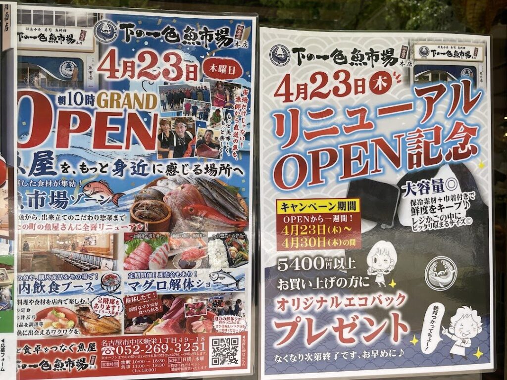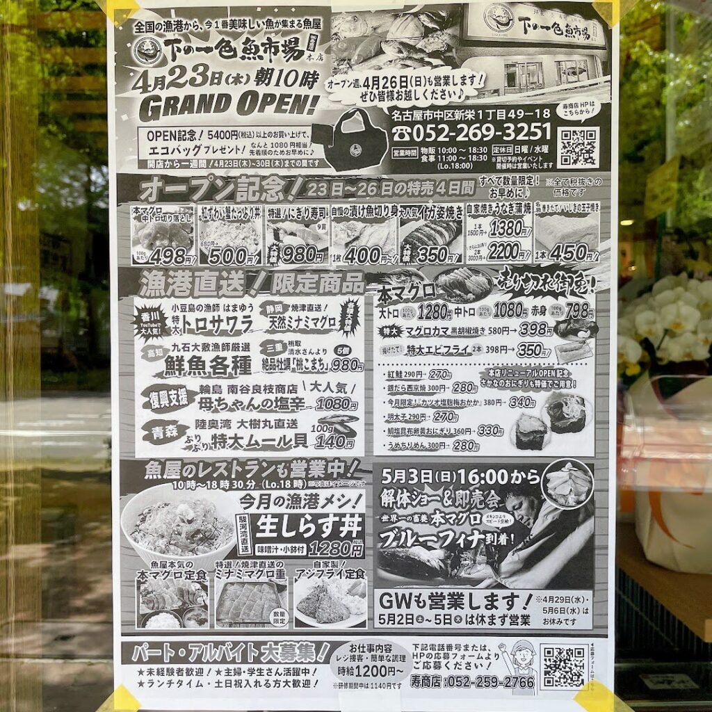 「下の一色」グループを運営する名古屋の老舗鮮魚卸・株式会社寿商店が、名古屋市中区・千早交差点近くに構える「下の一色 本店」を全面リニューアル。「食卓と漁港をつなぐ魚屋」をテーマとしたレストラン併設型鮮魚店「下の一色魚市場 本店」として、2026年4月23日(木)にリニューアルオープンします。