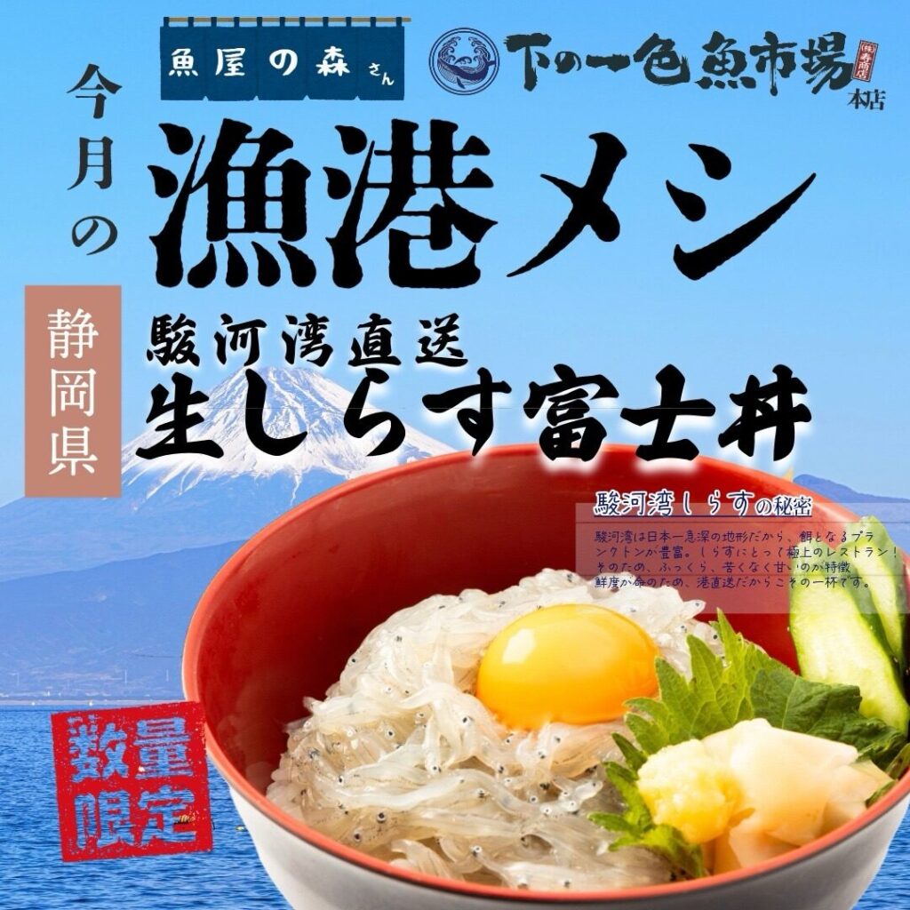 駿河湾は、富士山からの雪解け水が地下水となり、湧水として流れ込むことから豊かな漁場が形成されることで知られています。「駿河湾直送 生しらす富士丼」は、そんな駿河湾で水揚げされたぷりぷりの生しらすを丼にした贅沢な逸品。この時期ならではのとびっきりのしらすの美味しさを丼で豪快に楽しめます。