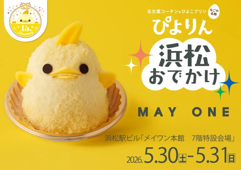 2026年5月30日・31日には、「ぴよりん」が浜松に初のおでかけ!「浜松駅ビル メイワン」の開業38周年記念および「ぴよりん」誕生15周年記念企画の一環として、「浜松駅ビル メイワン」の本館7階に設けられる特設会場にて数量限定で販売されます。