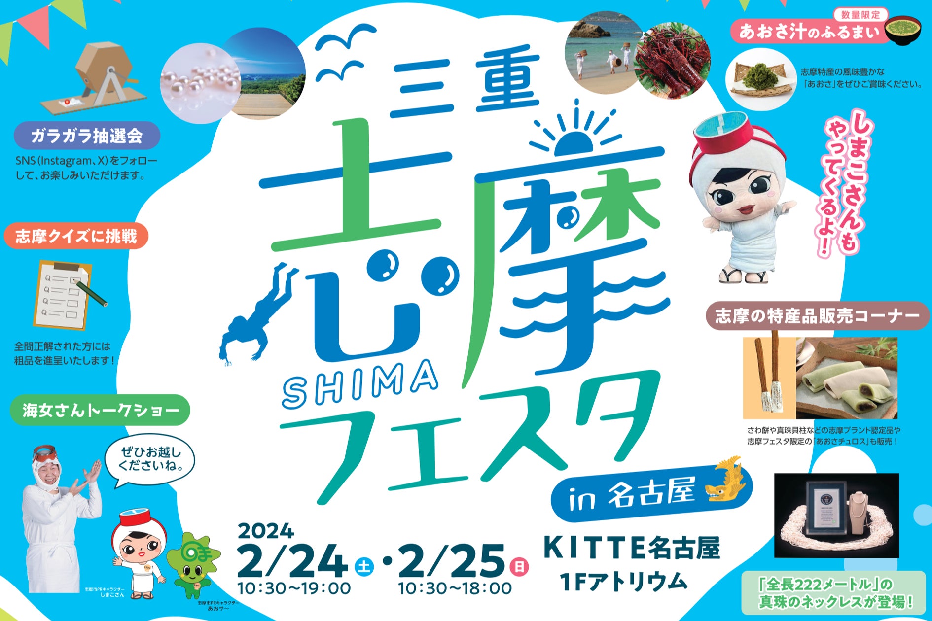 会場では「志摩ブランド」認定商品をはじめとした志摩の特産品の販売や、現役の海女によるトークショー、志摩市公式キャラクター「しまこさん」のグリーティングなども開催。2/24には志摩市長も駆けつけ、志摩の観光の魅力について語るとのことです。