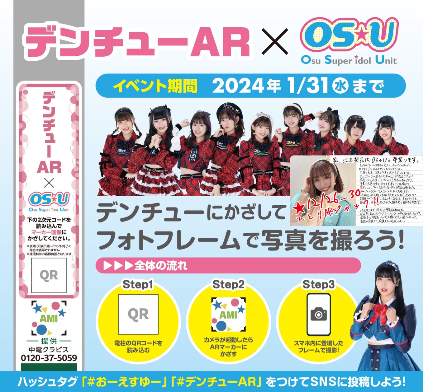 大須商店街で開催中の「デンチューAR実証実験」は、大須商店街様の様々なイベントを盛り上げるツールとしてAR活用した広告キャンペーンの実証実験。現在は、中部電力グループの中電クラビスと「ご当地アイドル四天王」の称号を持ち愛知県名古屋市大須を拠点に活動する女性ローカルアイドルグループ『OS☆U(にぎわいファクトリー名古屋所属)』のコラボよりAR実証実験が2024/1/31まで開催されています。