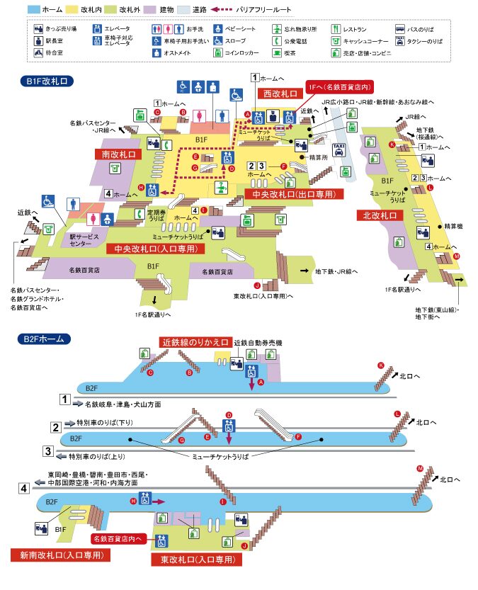 このうち、乗車に使われるのは原則として1番ホームと4番ホーム。「名古屋本線の岐阜方面、犬山線、津島線」へと向かう列車に乗車する場合には1番ホームから、「名古屋本線の豊橋方面、常滑線、知多線」へと向かう列車は4番ホームから乗車します。