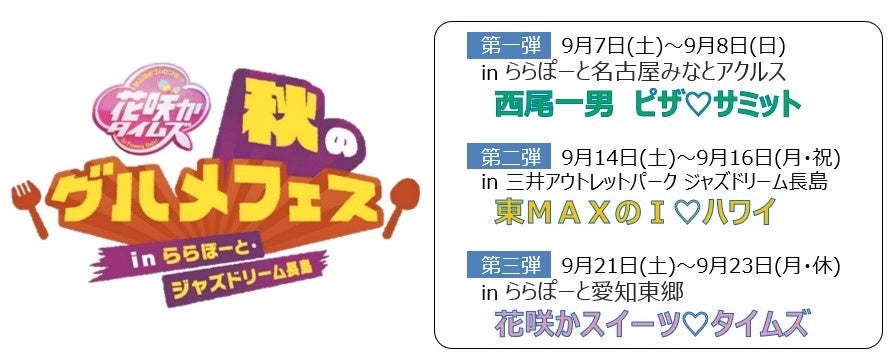 CBC「花咲がタイムズ」とタイアップしたグルメイベント『花咲かタイムズ秋のグルメフェスinららぽーと・ジャズドリーム長島』が9月7日~23日の土・日・祝に、ららぽーと名古屋みなとアクルス・ららぽーと愛知東郷・ジャズドリーム長島の3ヶ所で開催。番組内でも人気の「西尾一男」プロデュースのピザサミットや番組MC東MAXが愛してやまないハワイをテーマにした食フェス、モンサンクレール オーナーシェフの辻口氏とシェシバタ オーナーシェフの柴田氏によるオリジナルスイーツ販売など、見逃せない企画が盛りだくさんです。